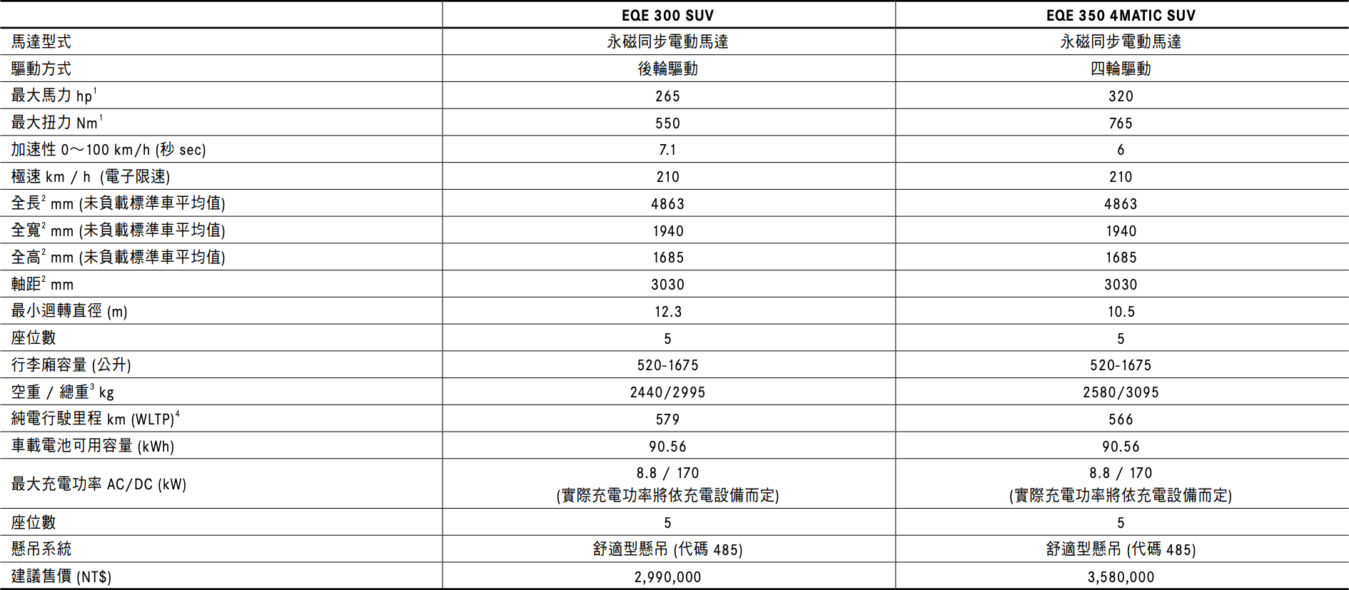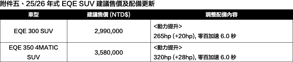 隨著年式更新,EQE 300 SUV 與 EQE 350 4MATIC SUV 在性能與效率上全面進化,帶來更強勁、順暢的純電駕馭體驗。EQE 300 SUV 現在具備 265 hp 的最大輸出,較前一代提升 20 hp,0–100 km/h 加速僅需 7.1 秒;EQE 350 4MATIC SUV 則進一步提升至 320 hp,動力增加 28 hp,0–100 km/h 加速縮短至 6.0 秒,展現純電動力的即時反應與澎湃能量。在性能升級的同時,Mercedes-Benz 亦持續展現卓越的能源管理能力。EQE 300 SUV 最高純電續航可達 579 公里,而雙馬達四驅的 EQE 350 4MATIC SUV 亦擁有 560 公里 的續航表現,完美平衡動力與效率。最後,全車系標配:多光束智慧型數位頭燈、主動環景式內裝照明與進階娛樂套件,打造更沉浸的數位豪華體驗;而 EQE 350 4MATIC SUV 更搭載「後軸轉向系統」(最大轉向角達 10 度),讓純電駕馭不僅靜謐舒適,更兼具靈活動感,完美詮釋 Mercedes-Benz 對電動豪華的獨到演繹。