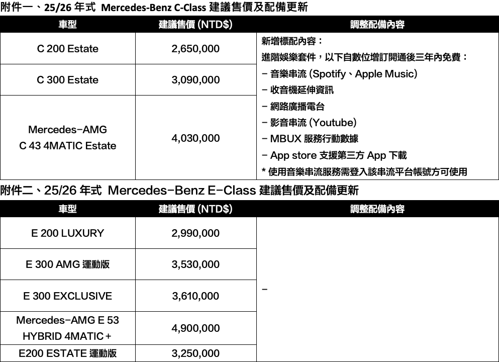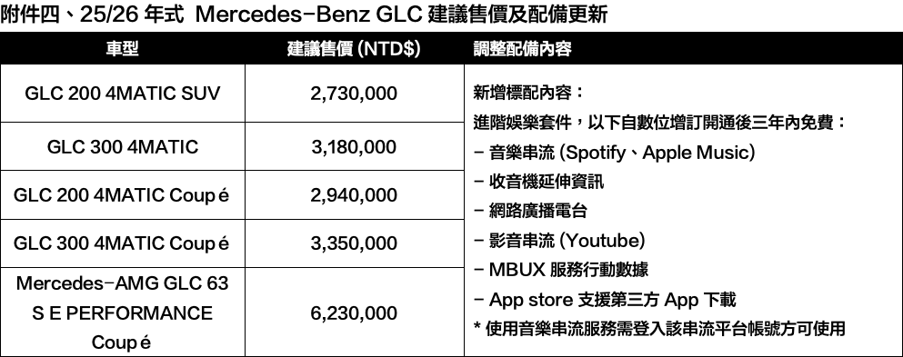 全新 25/26 年式 AMG GT Coupé 升級搭載 MBUX 3.0 多媒體系統與進階娛樂套件,讓車艙成為智慧生活的延伸場域;旗艦車款 S-Class 推出專屬夜色運動套件,以獨特外觀設計與精緻內裝細節,詮釋低調奢華的尊榮氣度;純電車型 EQE 300 SUV 與 EQE 350 4MATIC SUV 則在動力輸出與駕馭樂趣上全面升級,為純電豪華再添魅力。
