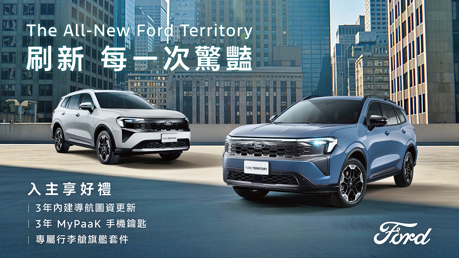 活動期間入主The All-New Ford Territory享優惠價84.9萬起(含舊換新及貨物稅減徵補助),並加碼提供三大好禮。動力方面,The All-New Ford Territory提供1.5T Per4mance Hybrid四電驅渦輪油電及1.5T汽油渦輪雙動力,滿足不同家庭用車需求。其中1.5T Per4mance Hybrid四電驅渦輪油電系統,採用「原生油電工程架構」設計,搭載專屬Dedicated Hybrid Engine油電渦輪增壓引擎以及Dedicated Hybrid Transmission雙速油電變速系統,並結合Hybrid永磁電動P3 Motor(驅動電機)及Hybrid永磁電動P1 Motor(發電電機)實現電能直驅與高效發電,輸出綜效最大馬力245ps、最大扭力55.6kg-m,並具備20.0km/L的最佳平均油耗表現,綜效續航里程突破1,000公里,兼顧節能效率與充沛動能;汽油渦輪車型則搭載1.5T EcoBoost®渦輪汽油引擎,採用缸內直噴技術與CVVT雙連續可變汽門正時系統,提供最大馬力163ps與最大扭力25.5kg-m,並搭載國際大廠Magna的Dual-Clutch Transmission七速濕式自手排變速箱,駕駛模式除了標準、運動與節能駕駛模式外,另提供專屬山路模式,帶來更具樂趣與層次的駕馭體驗。在空間與安全表現上,The All-New Ford Territory以2,726mm軸距打造寬敞舒適的車室機能,提供同級唯一後座平整化地面設計,並具備充裕的頭部與膝部空間,搭配多達22處置物空間與同級最大1,150mm後行李廂開口,結合6/4分離椅背與足踢感應式電動尾門,全面滿足家庭日常與出遊載物需求。安全科技方面,搭載領先同級的Ford Co-Pilot360™ Drive+全方位智駕科技輔助系統,結合360⁰環景影像行車輔助系統、FAPA主動式停車輔助系統5.0與LRAS循跡倒車輔助功能,智慧科技帶來行車與停車新感受;車體結構則採用超過65%超高強度鋼材,搭配八橫六縱鋼骨工藝與360⁰環形結構,並於A柱至B柱採用硼鋼強化與門框熱成型一體式設計,為全家出行提供穩固可靠的安全防護。