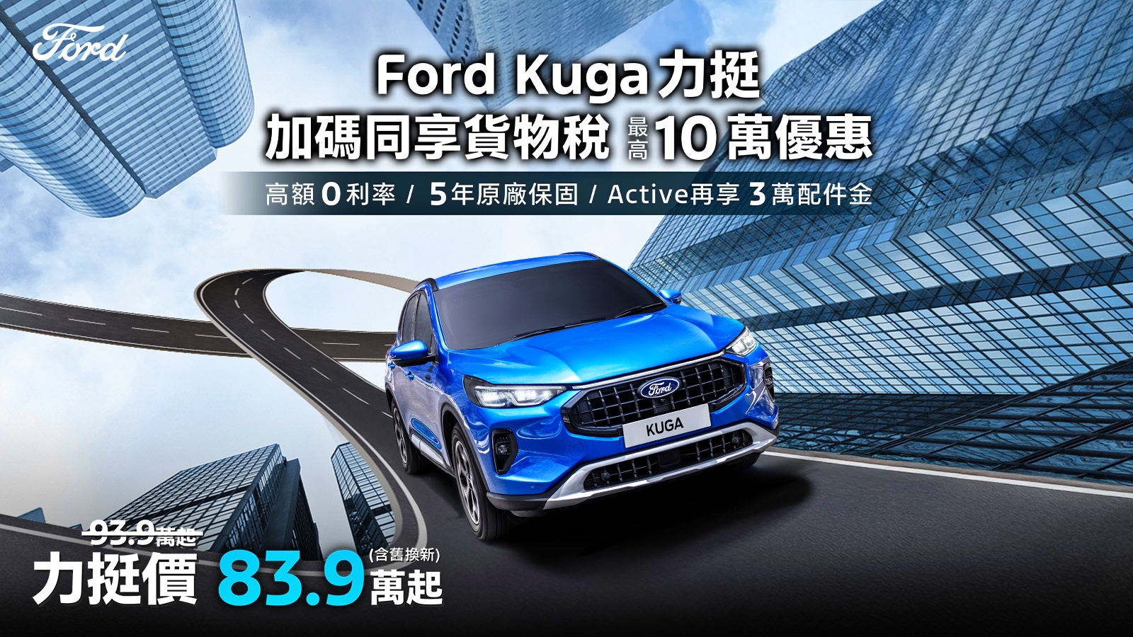活動期間入主The All-New Ford Kuga 1.5T享力挺價83.9萬起(含舊換新),內含5萬元力挺購車金、高額0利率及5年原廠保固,1.5T Active再加碼3萬元配件金;感謝萬名車主一路相伴。
