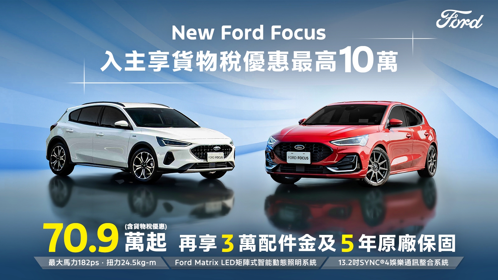 活動期間入主New Ford Focus享3萬元配件金及5年不限里程原廠保固。