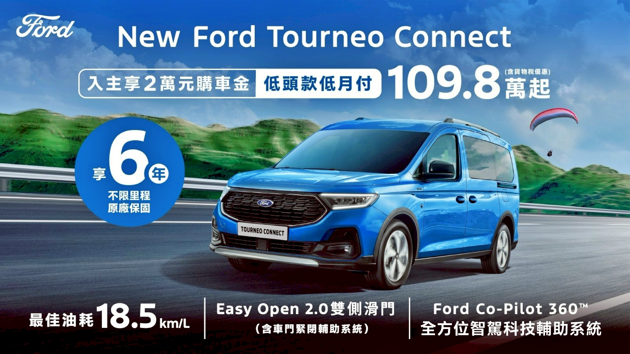 New Ford Tourneo Connect福特旅玩家享入主享低頭款5萬元、低月付8,888、2萬元購車金及6年不限里程原廠保固。