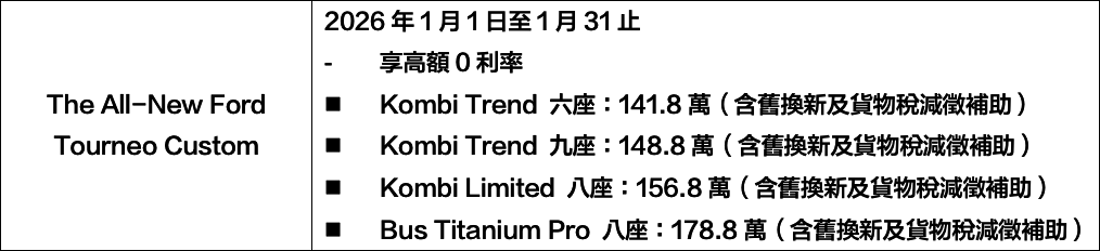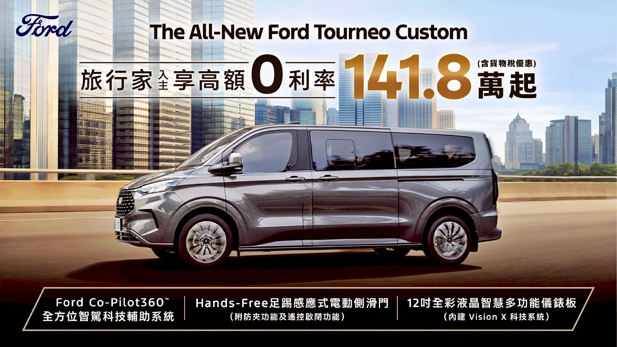 The All-New Ford Tourneo Custom福特旅行家活動期間同步享有高額0利率購車優惠。+Ford一月份車款優惠方案