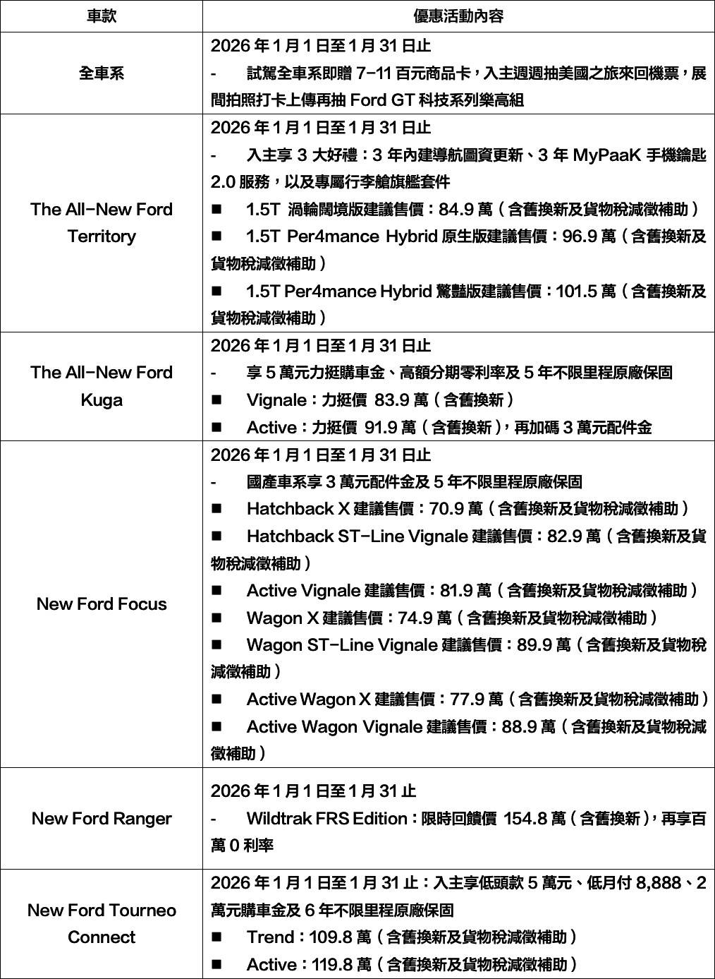 而福特六和旗下車款促銷好禮豐富,活動期間入主The All-New Ford Territory享優惠價84.9萬起(含舊換新及貨物稅減徵補助),並加碼提供三大好禮:3年內建導航圖資更新、3年MyPaaK手機鑰匙2.0服務,以及專屬行李艙旗艦套件;入主The All-New Ford Kuga 1.5T享力挺價83.9萬起(含舊換新),內含5萬元力挺購車金、高額0利率及5年原廠保固,1.5T Active再加碼3萬元配件金;感謝萬名車主一路相伴,New Ford Ranger Wildtrak限時推出回饋價154.8萬(含舊換新),再享百萬0利率;福特六和以多元購車方案揭開2026新年序幕,邀請消費者把握購車良機,展開全新駕馭旅程!