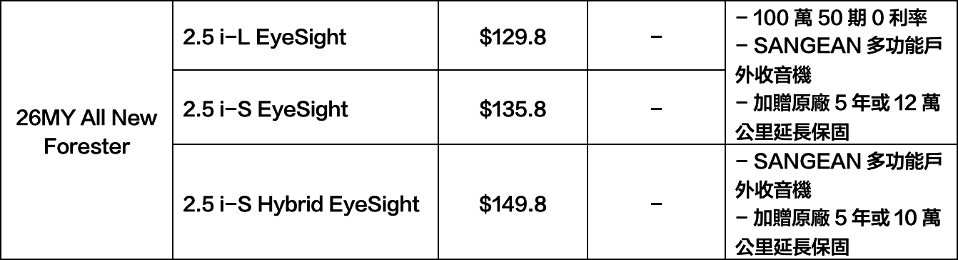 全新6th FORESTER憑藉其卓越的駕馭性能、高實用性和乘坐舒適性、強悍越野能力,以及SUBARU始終堅持的最高規格安全性,榮獲2025-2026 Japan COTY(Japan Car of the Year)日本年度風雲車大賞,為歡慶全新6th FORESTER勇奪這項非凡的榮耀,同時迎接新年新車、優惠加碼再釋出,本月入主全新6th FORESTER汽油版車型(2.5 i-L ES / 2.5 i-S ES),即可享100萬50期高額0利率,再加贈SANGEAN 多功能戶外收音機限量交車禮及原廠5年或12萬公里延長保固,讓喜愛全新世代森林人的消費者都能輕鬆入主這款佳評如潮的日本年度風雲車款。此外,SUBARU台灣意美汽車本月同步推出「新年煥新計畫」,以超越對手的安全科技配備和CUV級距同級唯一搭載SAWD對稱式全時四驅系統的跨界潮旅Crosstrek,本月入主優惠加配一次到位,搭配政府舊換新最高10萬補助不用百萬即可輕鬆圓夢;凡購買Crosstrek指定車款本月超狂優惠價109.8萬起,再享90萬50期0利率並全面配件升級二選一(可選1.升級360度環景系統、2.電動尾門+無線充電),全車系均加贈原廠5年或12萬公里延長保固。