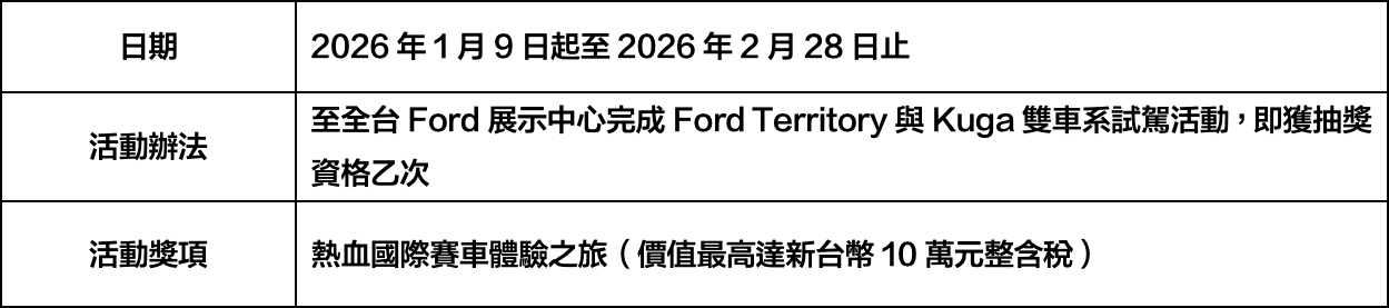 自2026年1月9日起至2月28日止,至全台Ford展示中心完成Ford Territory與Kuga雙車系試駕活動,即可獲得「國際賽車體驗之旅」(行程價值新台幣10萬元整含稅)抽獎資格乙次,最大獎有機會親臨F1 2026新加坡站或日本站,感受世界頂級賽事的極速魅力!