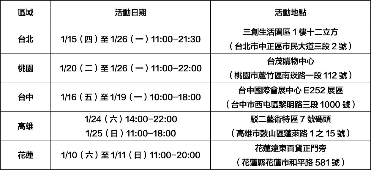 福特六和1月10日起分別於北中南東全台共5處地點展開 Ford 品牌車展。其中期程最長展示站點將於1月15日至1月26日進駐台北三創園區1樓十二立方。