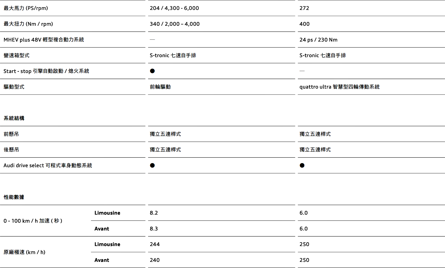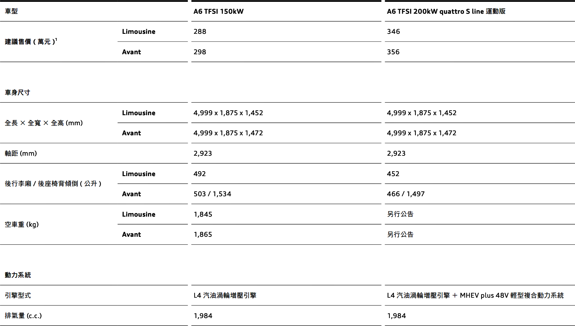 - Audi A6 TFSI 200kW quattro S line 車型配有 quattro 四輪傳動與 MHEV plus 48V 輕型複合動力系統,在穩定操控與動能效率之間取得細膩平衡,展現從容且精準的行路表現。