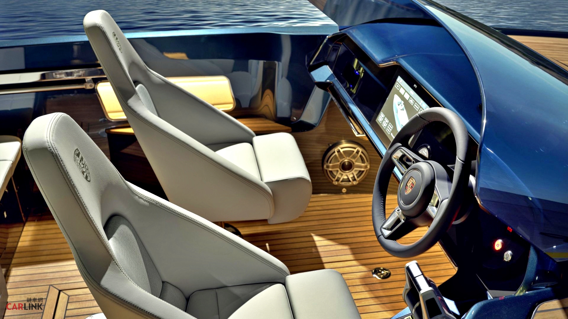 全新概念車與運動遊艇在內裝設計上亦展現高度一致性。Frauscher 790 Spectre 的啟動按鈕延續保時捷跑車配置,設於方向盤左側;以保時捷皮革包覆的方向盤,以及駕駛與前座跑車座椅,皆飾以保時捷盾型徽飾。五環儀錶採用經典保時捷圖形設計,呼應源自祖文豪森的運動基因;後座長椅的直向縫線靈感則取自保時捷座椅設計語彙,進一步彰顯雙方一致的設計理念。