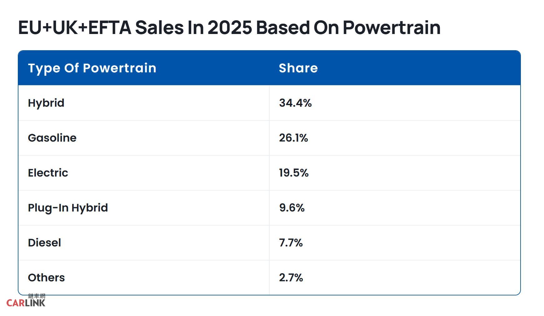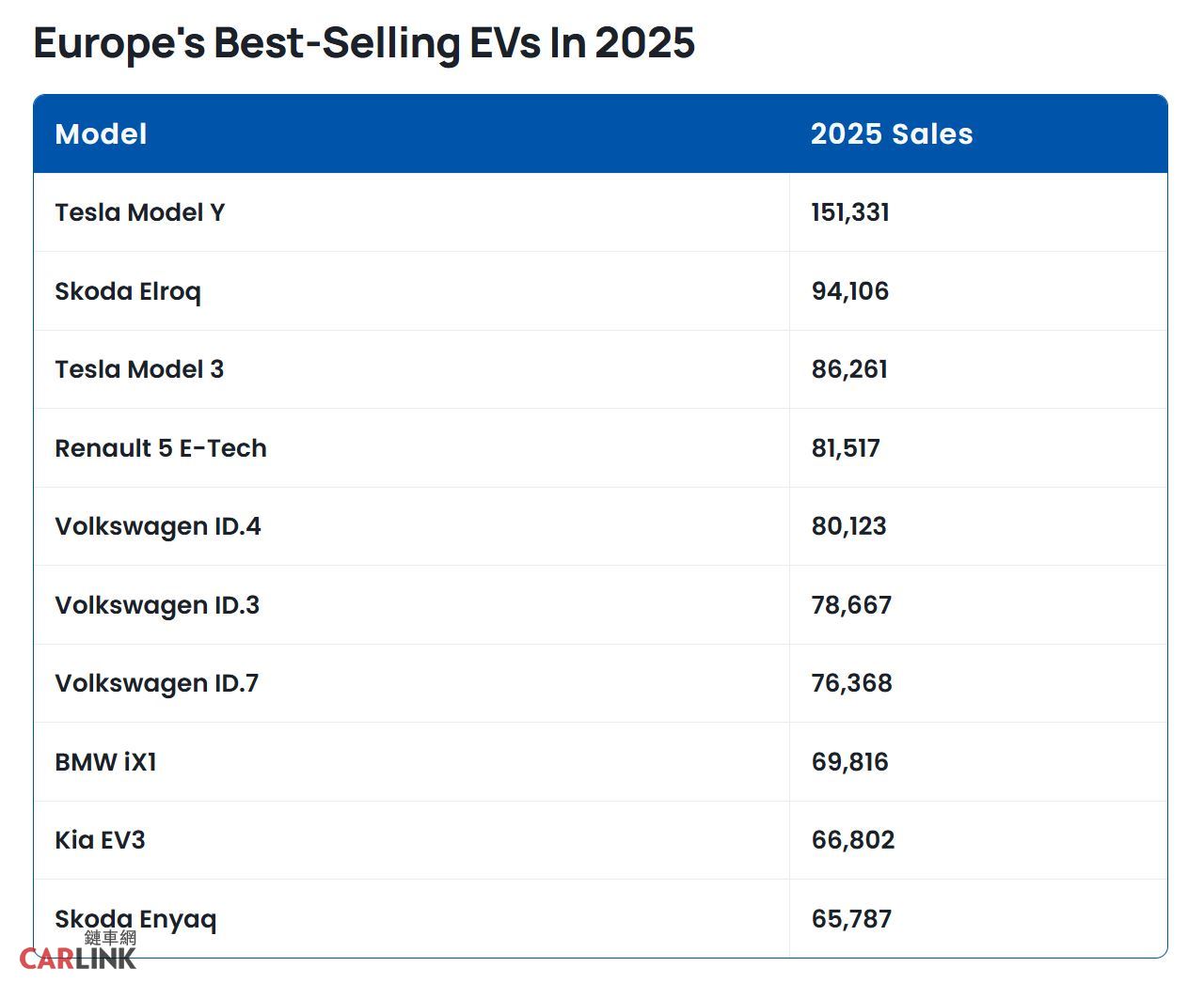 但整體來說,2025年純電動新車的銷售佔比為19.5%,大概就是1/5,純粹的汽油引擎新車因價格便宜依然受到歡迎,至於Hybrid則是有大爆發的趨勢,但不可否認,許多都是48V輕油電而不是電壓超過250V的Full Hybrid(名詞解釋 https://www.lian-car.com/articles/read/40622.html ),因此不要覺得Toyota、Honda、Nissan的Hybrid動力可以在此耀武揚威,並沒有!就歐洲的發展趨勢來說,48V輕油電之上,可能會跳過Full Hybrid這一關,直接上看PHEV,畢竟Full Hybrid並不能保證能在嚴苛的歐七或歐八環保法規當中取得絕對優勢,但PHEV可以!但最大問題在於~許多PHEV車主「只加油、不充電」非常不環保,這也是許多車廠之後要想辦法「對付」的問題,也就是要準備好好地搞一下PHEV車主們(https://www.lian-car.com/articles/read/40730.html)。論及純電動車品牌,第一名一定是Tesla,但是如果只靠Model Y的銷售量是不行的,還必須加上Model 3的助攻才行,因為VW集團追上來啦!看得出來Skoda Elroq賣得非常好,甚至超越了Model 3,其中一個問題當然就是Volkswagen ID系列純電動造型設計並沒有打動人心,但Skoda Elroq加上Enyaq真的是太厲害了,不只空間很棒,造型也非常漂亮。難怪Volkswagen急著推動ID.4小改款,根本就是大幅度升級,而且還要改名為ID.Tiguan。