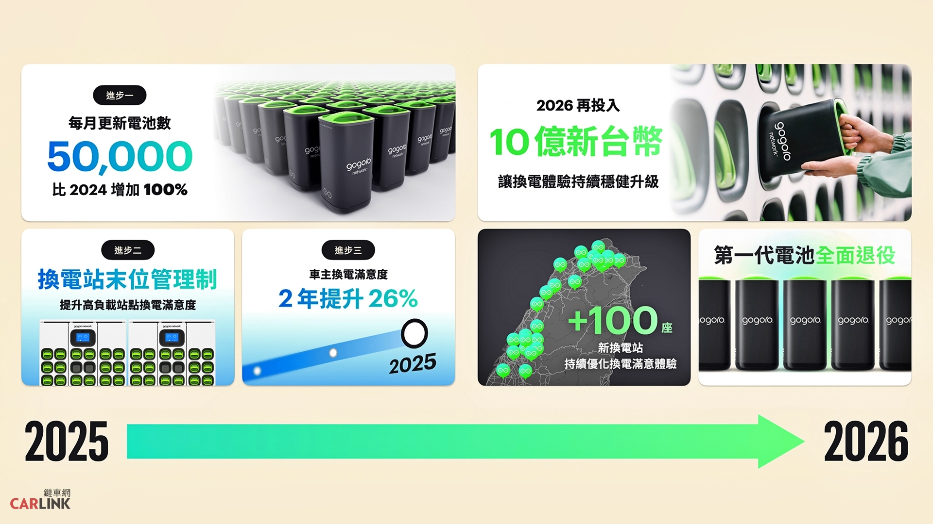根據車主使用需求,Gogoro 於 2025 年持續精進能源網路,每月更新五萬顆電池,較 2024 年翻倍,並推動換電站末位管理制度,透過量能擴充提升高負載站點的換電滿意度。2025 年營運數據顯示,車主換電滿意度兩年提升 26%,反映換電網路在服務品質與整體效率上的進步。此外,Gogoro 宣布見證台灣電動車產業十年發展的第一代電池已完成階段性任務,於今年全面退役,並將再投資新台幣 10 億元用於支持能源事業穩健發展;而在全台換電需求的核心熱區,Gogoro 也預計新增逾 100 座 GoStation,提供車主更優質的換電服務。