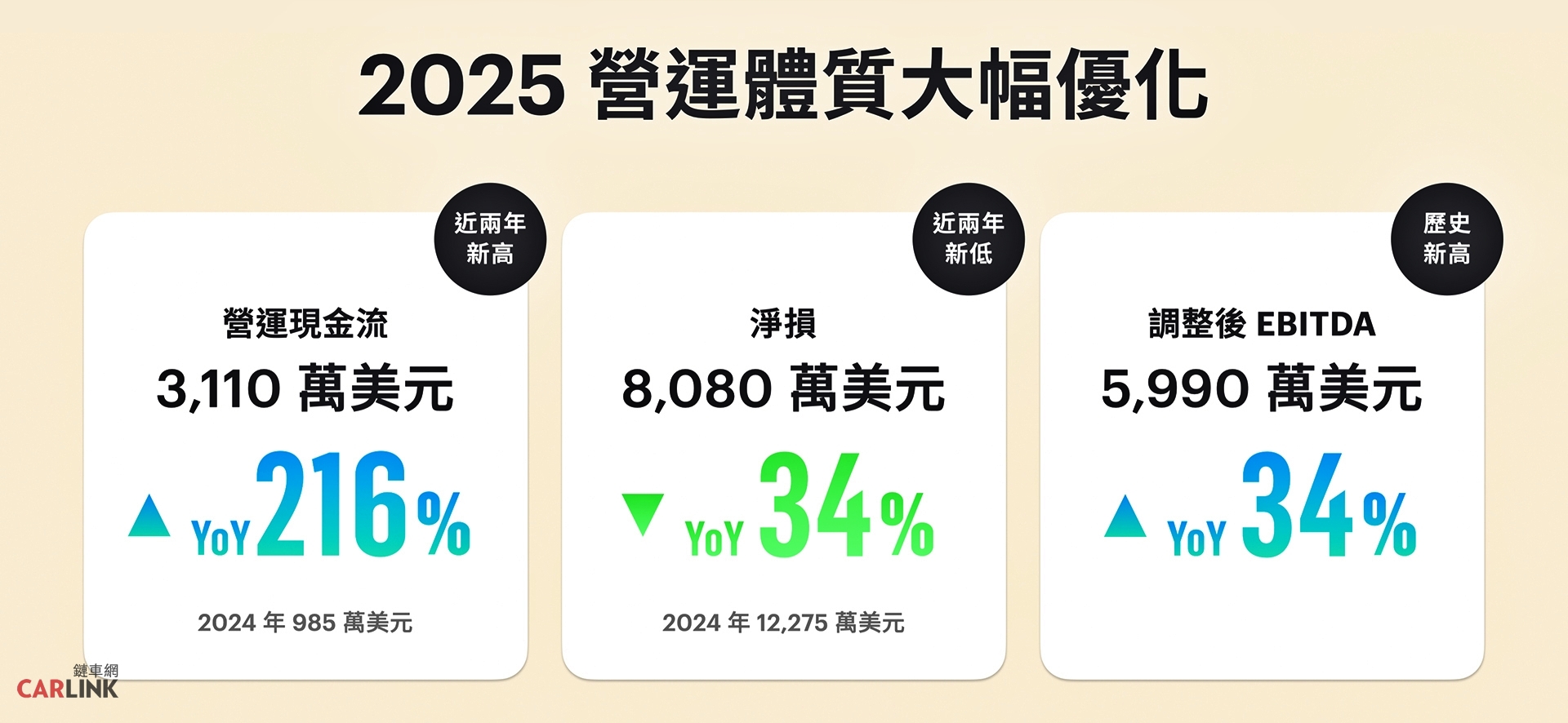Gogoro 2025 年度財報數據亮眼,顯示「聚焦」策略已顯著提升營運體質,建立了強健的財務基礎,為邁向 2026 年能源事業損益兩平、2027 年產生自由現金流,以及 2028 年車輛事業損益兩平奠定穩固根基。全年營運現金流成長至 3,110 萬美元,較前一年大幅提升超過 2 倍;調整後 EBITDA 較 2024 年增加 34%,創下 5,990 萬美元的歷史新高。隨著營運效率提升與成本結構優化,全年淨損年減 34%,收斂至 8,080 萬美元。