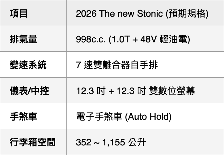 2026 年新款 Kia Stonic不僅保留了省稅金的 1.0T 輕油電動力,更補足了過去玩家最在意的內裝科技與主動安全。在眾多入門小休旅中,Stonic 憑藉著全面進化的數位介面與更完整的 Drive Wise 輔助系統,再次定義了什麼叫「高 CP 值進口首選」。+上市與時程資訊