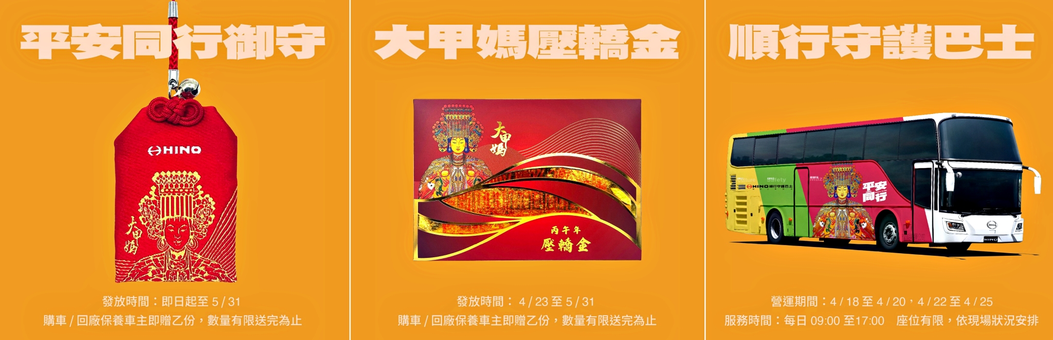 即日起至5月31日止,凡購買HINO商用車或TOYOTA GRANVIA、HIACE及 COASTER,回HINO原廠保養維修之車主,即可獲贈由HINO精心設計、經大甲鎮瀾宮過爐的「平安同行御守」乙個。另自4月23日起至5月31日止,符合前述條件者,加碼贈送「大甲媽壓轎金」乙份。