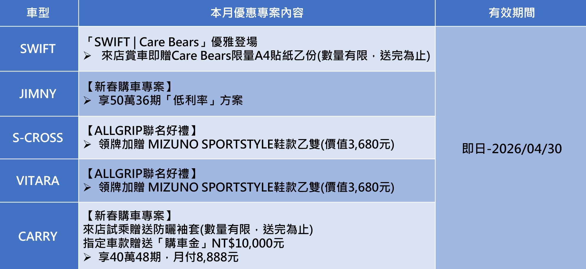 「SWIFT | Care Bears」限量彩繪特仕車款現已巡迴於全台 SUZUKI 展示中心開放鑑賞。即日起來店賞車,即可獲得 Care Bears 限量A4貼紙乙份(數量有限,送完為止),讓可愛不只在車上,更延伸到你的生活日常。CARRY神助攻!領牌送購車金 × 試乘贈專屬防曬袖套,最有感的入主時機