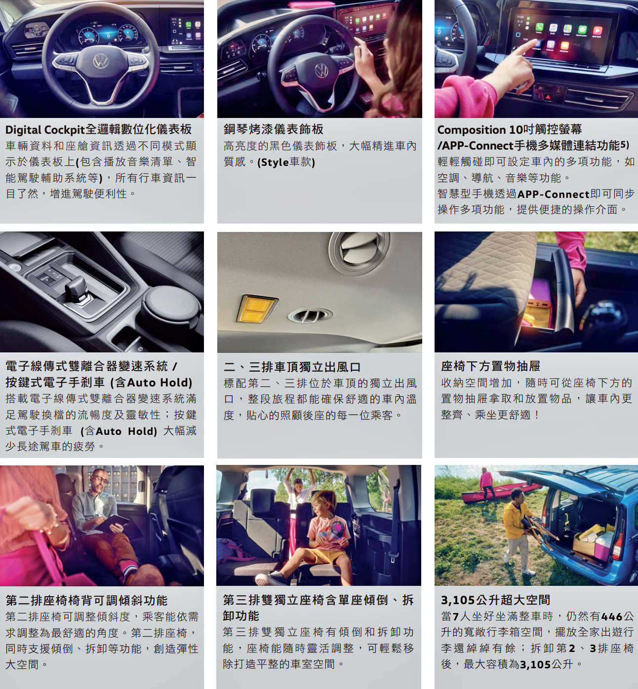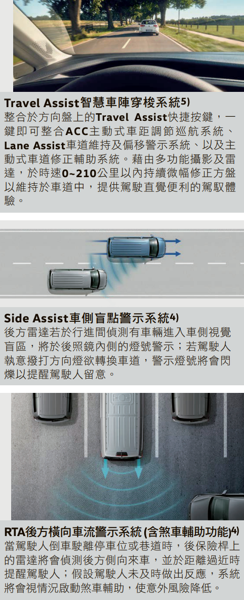• 德制正七人座休旅 Caddy Maxi EasyLife,全車標配 IQ.Drive 智能駕駛輔助系統,擁有完整7人座空間,款待每一位乘員