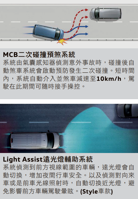 Caddy Maxi EasyLife標配IQ. Drive智能駕駛輔助系統,搭載包含 Front Assist 車前碰撞預警系統 (含AEB 自動輔助緊急煞車功能)與前方行人/騎士偵測系統、FTA 前方橫向車流警示系統(含煞車輔助功能)、ACC 主動式車距調節巡航系統、Lane Assist 車道維持及偏移警示系統(含修正輔助功能)、Side Assist 車側盲點警示系統與RTA後防橫向車流警示系統(含煞車輔助功能),以及MCB二次碰撞預煞系統、ESC 電子行車動態穩定系統、ABS 防鎖死煞車系統、EBD 電子煞車力道分配系統、EDL電子防滑差速器、ASR加速循跡控制系統、PDC後方停車引道系統、斜坡起步輔助裝置、疲勞駕駛警示系統與Exit Warning 離車安全警示系統,完善安全科技配備,守護每一次出行。