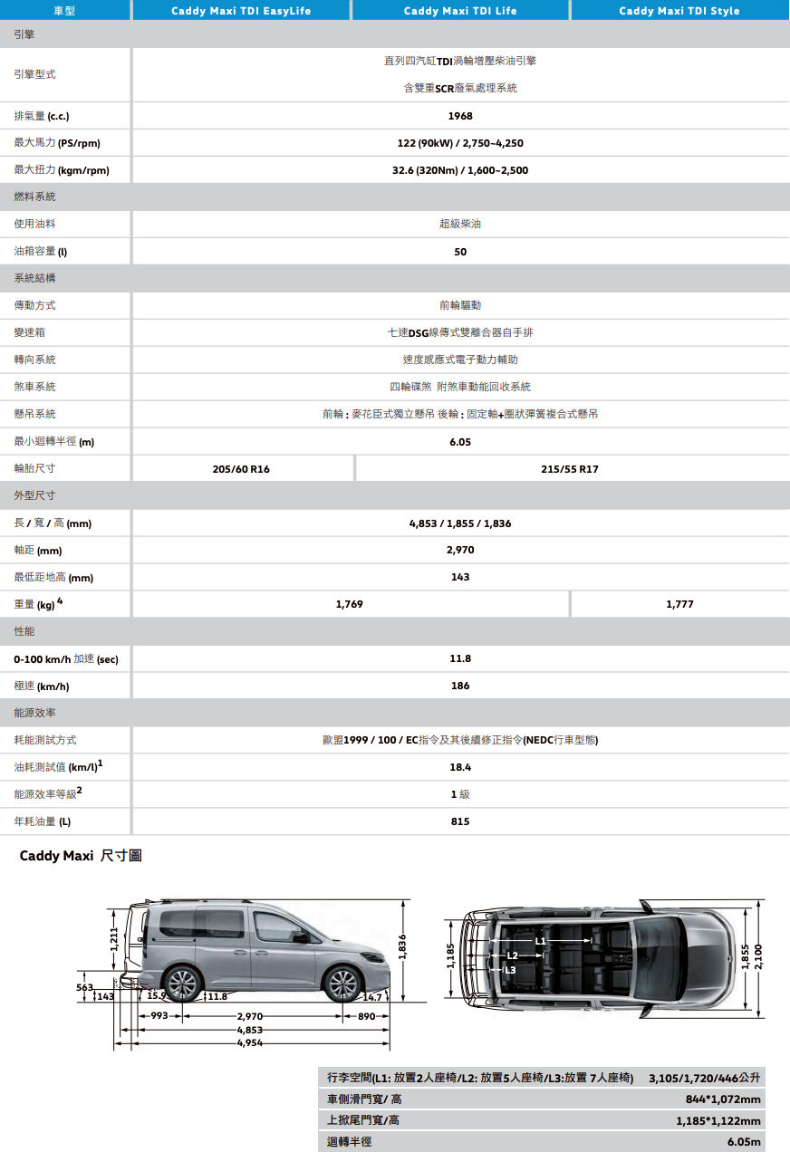Caddy Maxi EasyLife擁有德制品質與完善的安全配備,延續Caddy Maxi車系時尚洗鍊的外觀造型,搭載2.0 升直列四缸渦輪增壓柴油引擎配備、配備 16 吋鋁合金輪圈與光感應自動啟閉頭燈裝置,將低維護成本與日常實用性完美結合。內裝標配Digital Cockpit全邏輯數位化儀表板與大尺寸觸控螢幕,座椅使用Trialog 高級布椅材質,採用2-3-2座位配置,第二、三排座椅可拆卸及傾倒,承襲Caddy 家族寬敞靈活空間基因,無論是 7 人滿載,還是拆卸座椅進行彈性運用,裝載戶外運動用品或貨物等,都能游刃有餘滿足每個成員的需求。
