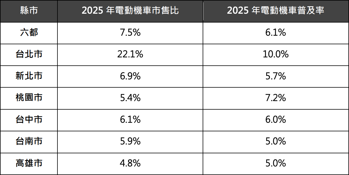根據交通部公路局統計,2025 年六都電動機車市售比為 7.5%、電動機車的普及率為 6.1%。六都中以台北市的市售比 22.1% 最高,且台北市的電動機車普及率也以 10.0% 領跑六都。意味著台北市每 5 台新售機車中,就有 1 台是電動機車;且全台北市每 10 台登記機車中即有 1 台為電動機車。台北市展現強大的政策執行力,成為六都中唯一達成 2025 年市售比 20% 目標的最佳典範城市。 SMAT 進一步分析台北市成功推動電動機車的關鍵要素,認為政策的延續性與可預測性是獨步全台的治理特色。台北市自 2021 年起便領先全台實施「三年一期」的複數年補助計畫,相較於其他縣市,此種長期且穩定的補助承諾,有效消弭民眾對於補助中斷的觀望心態,並建立穩定的市場信心。在政策定心丸的帶動下,台北市 2025 年的電動機車市售比成功衝上 22.1%,穩居全台第一,證明穩定的治理手段是城市加速運具結構轉型的關鍵推力。