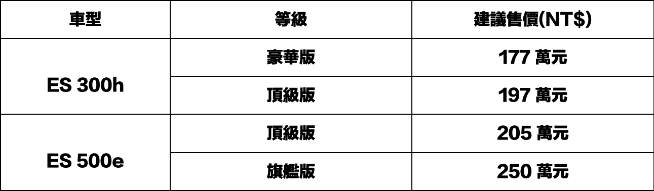 全新 ES 提供 ES 300h 豪華版、ES 300h 頂級版、ES 500e 頂級版與 ES 500e 旗艦版共四種等級,滿足不同顧客用車需求與品味。全新 ES 自即日起正式上市,誠摯邀請您立即入主,或洽全台 Lexus 經銷商營業據點預約試乘,親身體驗 ES 多元動力的駕馭魅力。