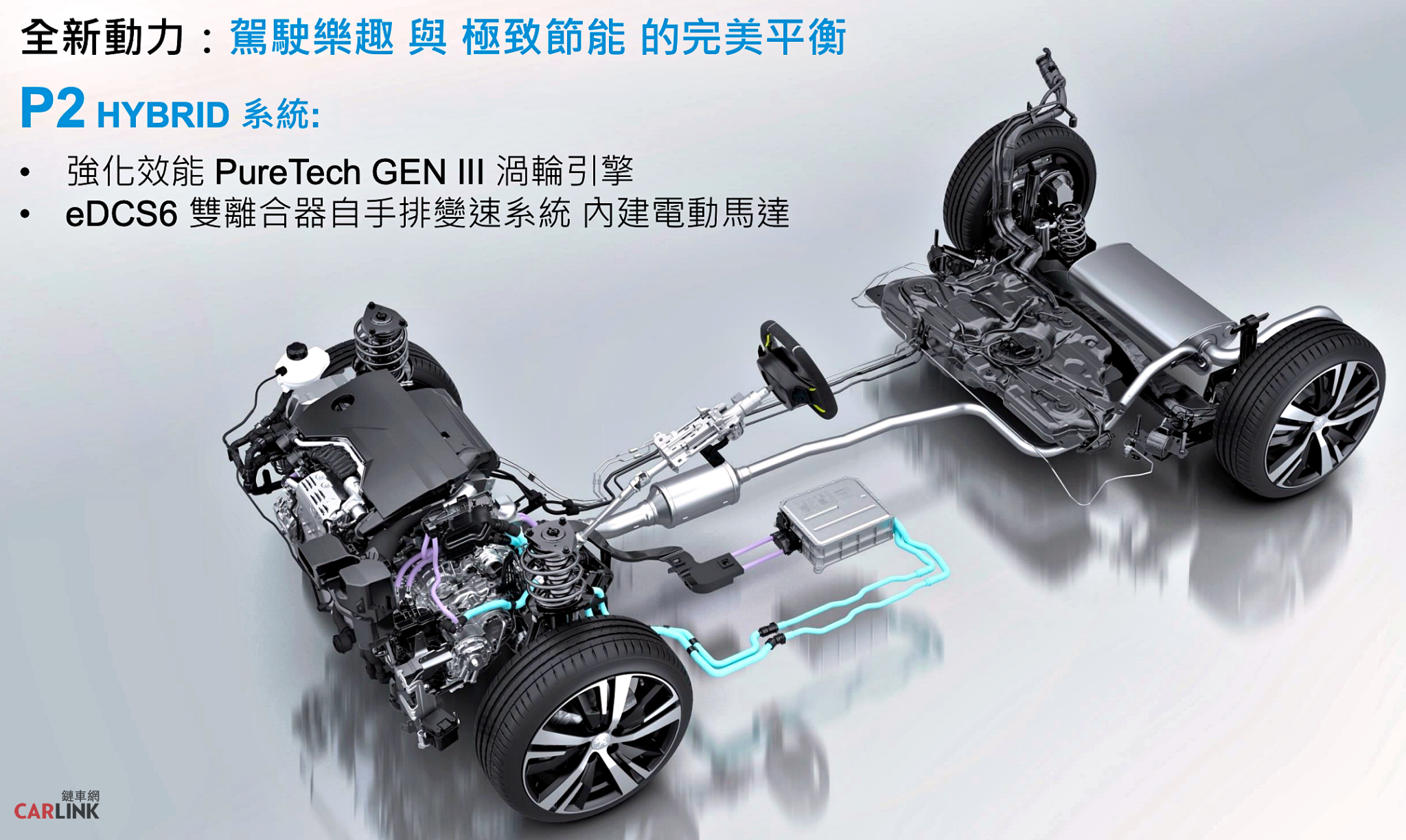 P2 HYBRID 油電混合動力系統以多次榮獲「國際引擎大獎」的 1.2L PureTech 缸內直噴渦輪增壓引擎為基礎,經軟硬體全面升級調校,進化為第三代全新引擎;搭配整合 P2 電機馬達的 e-DCS6 濕式雙離合器六速自手排變速系統,並透過電動馬達即時輔助,綜效輸出高達 145hp,兼具強勁加速與平順線性駕馭體驗。
