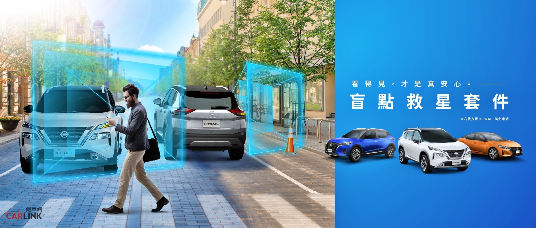 NISSAN國產指定車型推出專屬盲點救星配備,與您一起守護行車安全。本月凡入主NISSAN SENTRA、KICKS、X-TRAIL及X-TRAIL e-POWER等車型之指定規格即可享有購車金優惠回饋,其中X-TRAIL雖未滿足新購汽車之貨物稅減徵補助之條件,NISSAN仍加碼提供購車金金額,讓有意入主X-TRAIL的消費者也可享有同等優惠,以X-TRAIL經典版為例,入主即享11.1萬元購車金,若加計政府舊換新補助方案最高補助金額,最低僅需88.8萬元起。