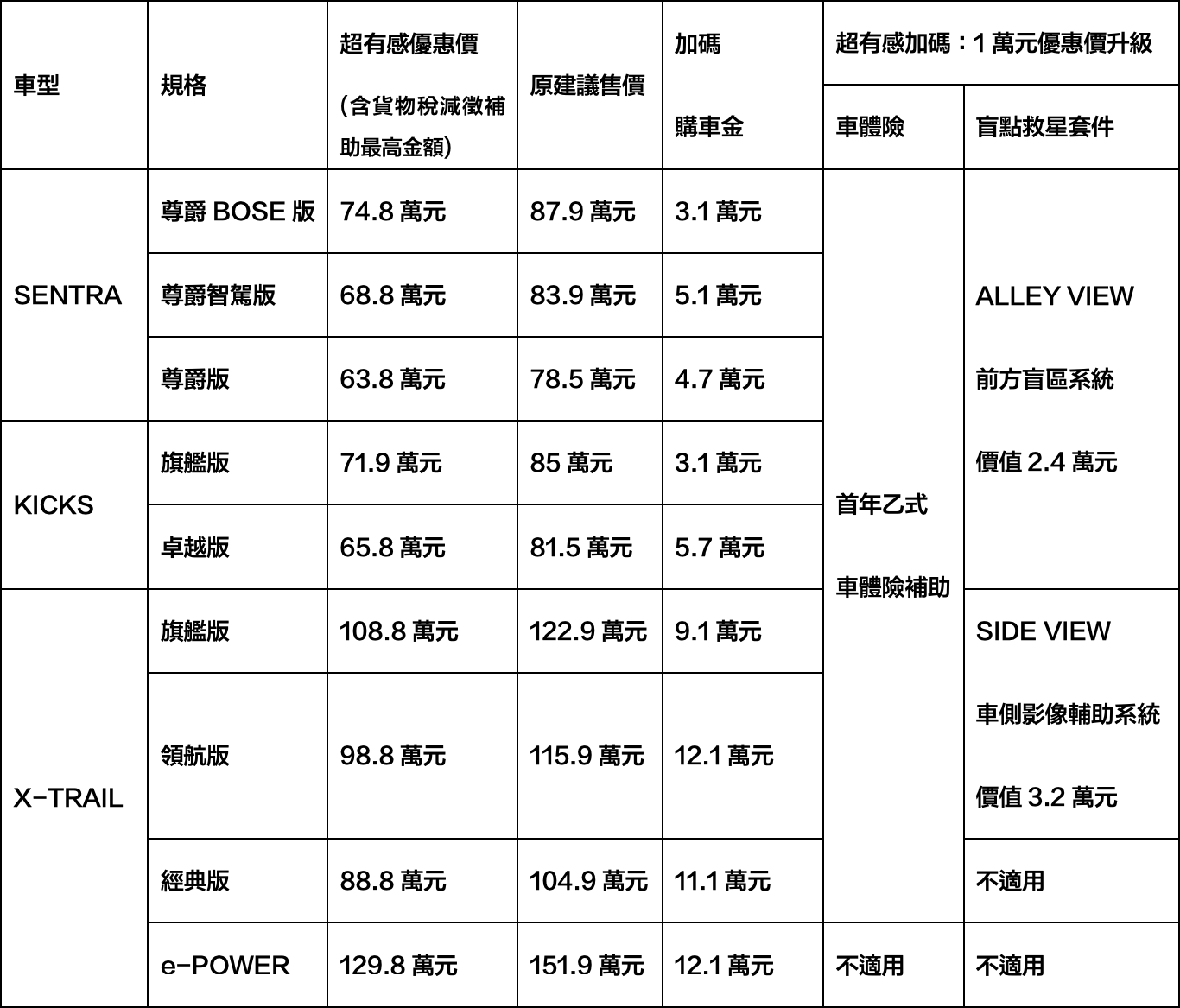 NISSAN重視車主行車保障與駕駛安全,針對國產全車系提供超有感加碼優惠,自費1萬元即享首年乙式車體險補助,提升車主用車保障;指定車型規格再升級「盲點救星套件」,包含:SENTRA及KICKS全車系將升級價值2.4萬元的「ALLEY VIEW前方盲區系統」;X-TRAIL旗艦版及領航版將升級價值3.2萬元的「SIDE VIEW車側影像輔助系統」,讓車輛於轉彎時可於車內即時顯示車側影像,警示提醒盲區來車與行人,有效減少駕駛時的視線死角,提升行車安全。上述首年乙式車體險補助加上「盲點救星套件」最高總價值可達6萬元,讓消費者獲得有感超值回饋。
