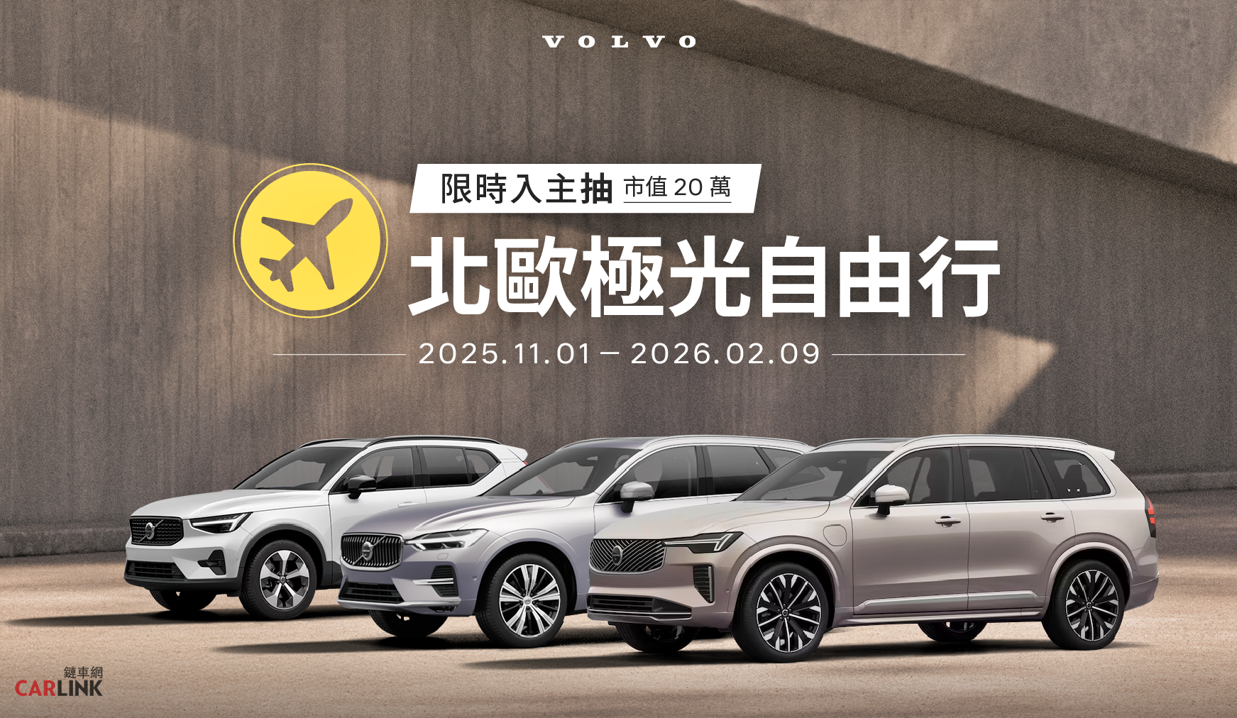 VOLVO為回饋廣大車主的支持,於指定期間內購買VOLVO全車系任一車款,不僅可享低首付、零利率等多元購車財務方案外,凡於2025年11月1日起至2026年2月9日期間掛牌之車主,還可參加總價值達20萬元之「北歐極光自由行註」抽獎活動。VOLVO EX30 Ultra以428hp/543 Nm最大動力輸出,帶來最快3.6秒零百加速,榮膺「極速純電小勁旅」之名,現在入主Volvo EX30可享120萬40期零利率分期專案,並享純電車主專屬禮遇(4年或8萬公里原廠保固),讓車主輕鬆展開純電新生活。身為台灣市場唯一搭載 PHEV 插電式油電複合動力的歐系中型豪華休旅,Volvo XC60 堪稱同級距中兼具駕馭快感與節能效率的首選,延續 VOLVO 一貫的北歐美學精神,外觀線條簡潔俐落,內裝則以精緻用料與細膩工藝,營造典雅豪華氛圍,成就現代豪華 SUV 的全新標竿。本月入主 XC60 可享首年超低月付 9,999 元或 19,888 元 / 26,888 元超低月付等輕鬆貸優惠方案,坐擁北歐中型豪華休旅就趁現在。旗艦級 XC90 是 VOLVO 安全與工藝的代表作,七人座配置提供靈活空間規劃,成就載人與載物的日常用車間的完美平衡,頂尖用料打造的舒適豪華車艙,在科技滿點的配備加持下盡顯旗艦本色,為每一次家庭旅程帶來極致舒適的一流體驗。本月入主 Volvo XC90 即可享 120 萬 40 期零利率財務方案,讓 XC90 成為滿載全家度過歡樂時光的最佳座駕。