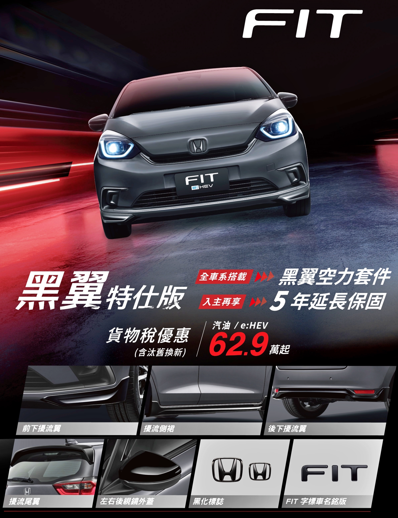 即日起~2025/12/31止入主FIT汽油版或節能省油王FIT e:HEV享「OVO便攜式智慧投影機*1」或「黑翼特仕版與5年延長保固*1」專案二擇一好禮,並可享貨物稅優惠(含汰舊換新)62.9萬元起。其中特仕版包含「前下擾流翼、擾流側裙、後下擾流翼、擾流尾翼、左右後視鏡外蓋、前後H黑化標誌、FIT字標車名銘版」的專屬豪禮,讓預算型買家購車零負擔。