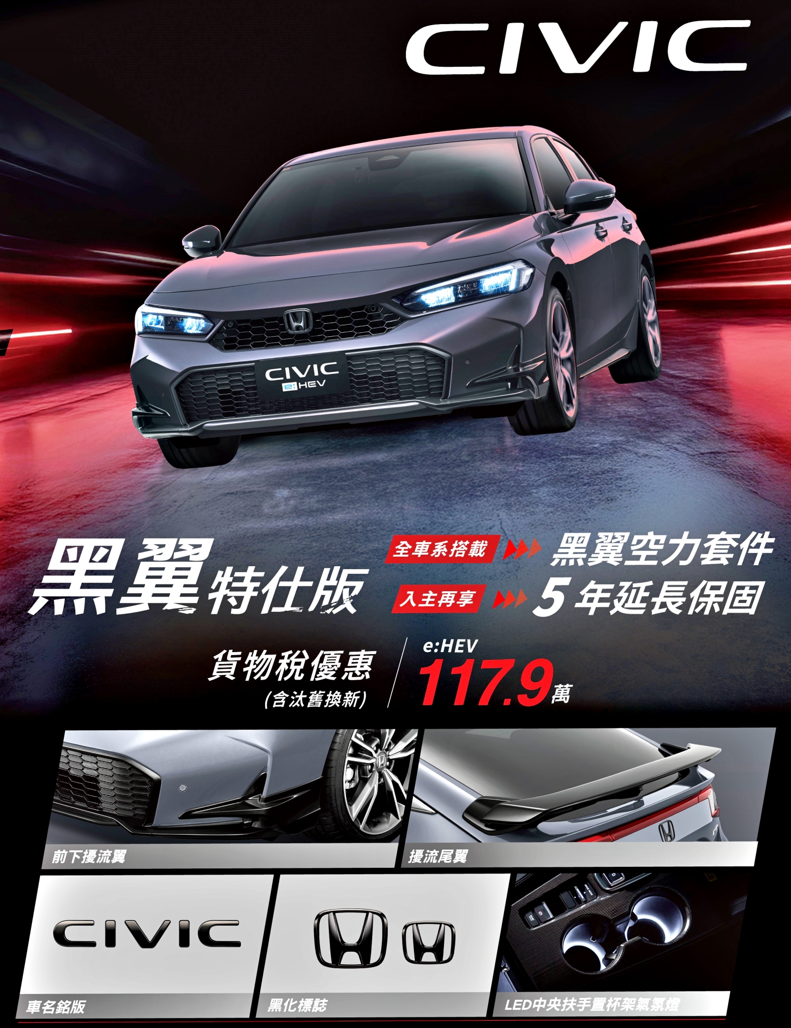 即日起~2025/12/31止入主CIVIC e:HEV次世代電油車享「OVO便攜式智慧投影機*1」或「黑翼特仕版與5年延長保固」專案二擇一好禮,並可享貨物稅優惠(含汰舊換新)117.9萬元。其中空力套件組包含「前下擾流翼、擾流尾翼、CIVIC車名銘版、前後H黑化標誌、LED中央扶手置杯架氣氛燈」,成就買家獨具魅力的零里程焦慮駕乘體驗。
