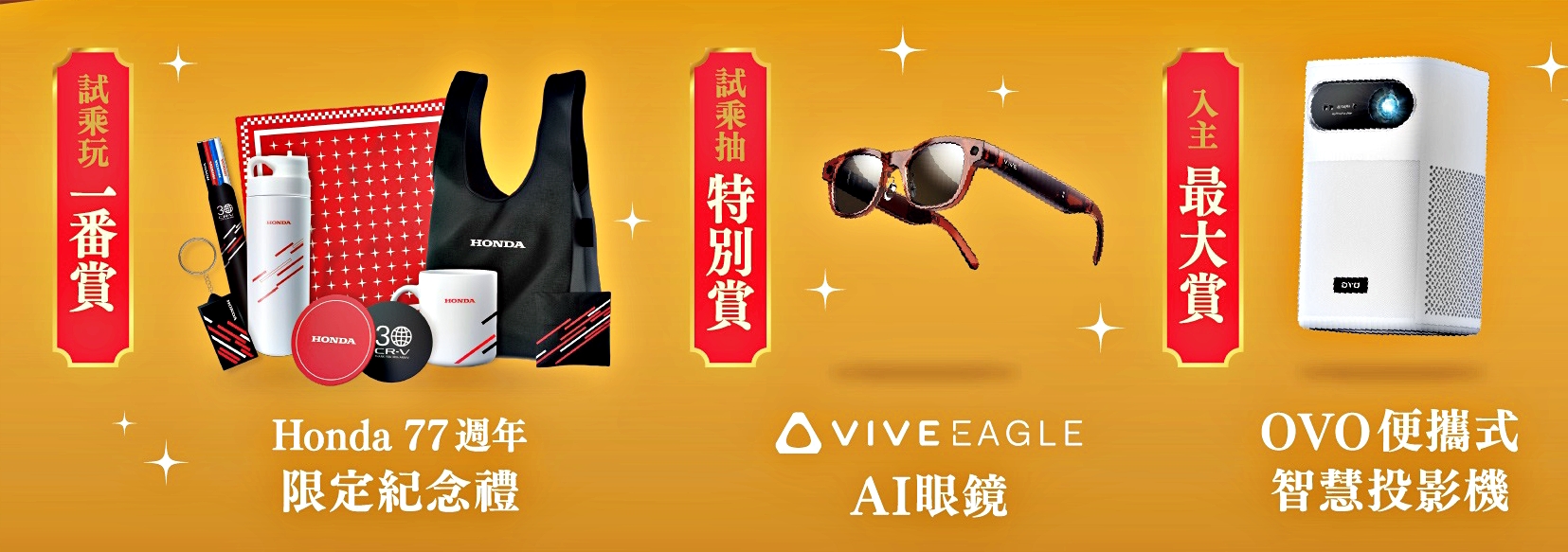 歡慶Honda誕生77週年,Honda Taiwan推出年終超值豪禮,即日起限時入主Honda全車系,享「OVO便攜式智慧投影機」或「黑翼特仕版與5年延長保固」二擇一豪禮,指定車款優惠總價值最高達20萬元。活動期間至全國Honda Cars試乘全車系,即可參加「好運一番賞」活動贈送的「Honda 77週年限定紀念禮」(7抽1)、週週再抽「VIVE EAGLE AI眼鏡」讓您帶回家。歡迎即刻至官網預約試乘或親臨全台展示中心,感受Honda的人車一體操控性能,重新定義您對駕馭樂趣的想像。