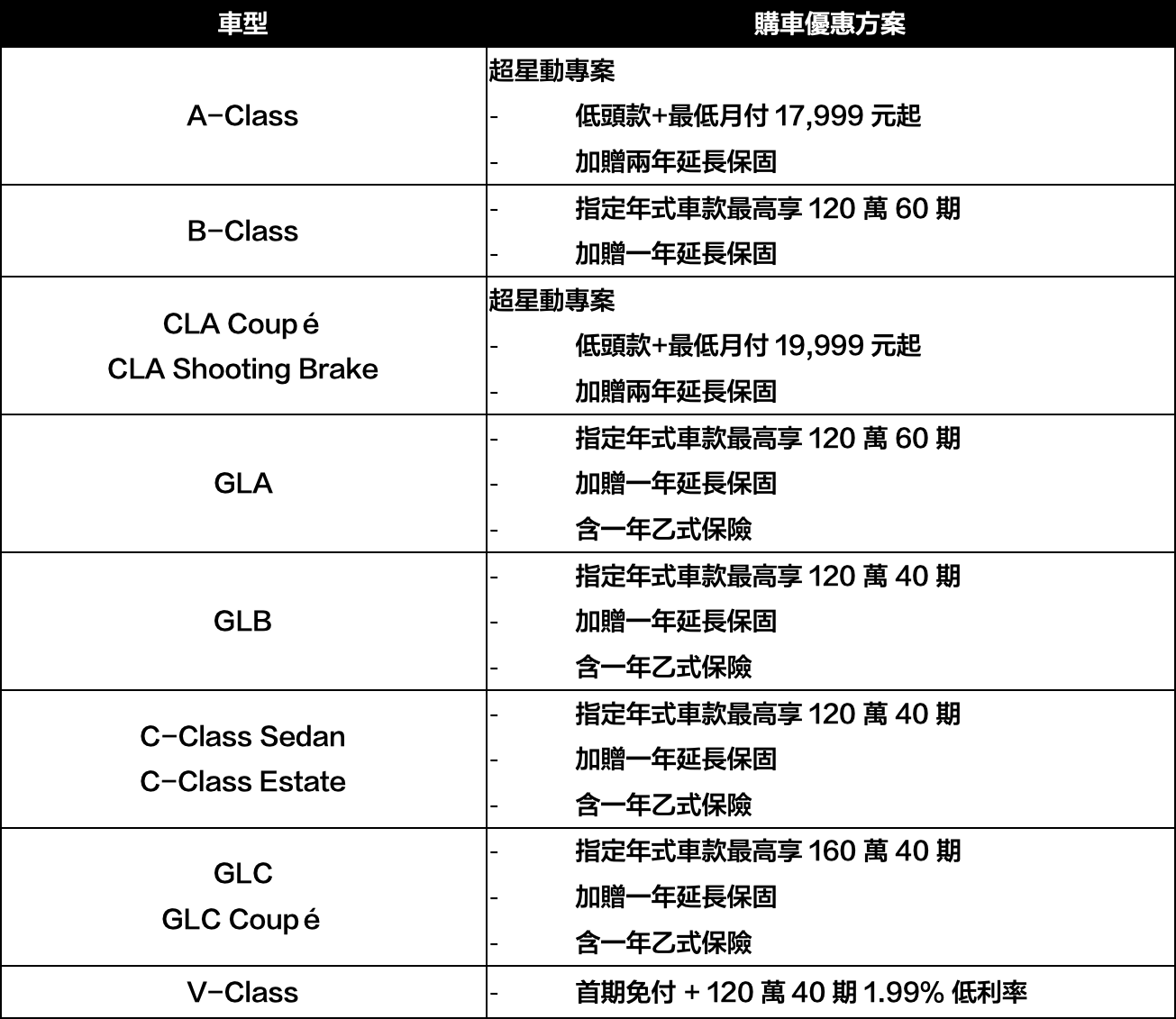 V-Class:針對家庭與商務客層,推出首期免付搭配 120 萬 40 期低利率優惠方案 ,以更輕鬆的方式擁有三芒星 MPV 的寬敞空間與豪華體驗,無論多人出行或高端接待皆完美滿足。配備升級結合超優惠方案,在年終之際,無負擔地輕鬆星動,即刻升級豪華移動體驗!