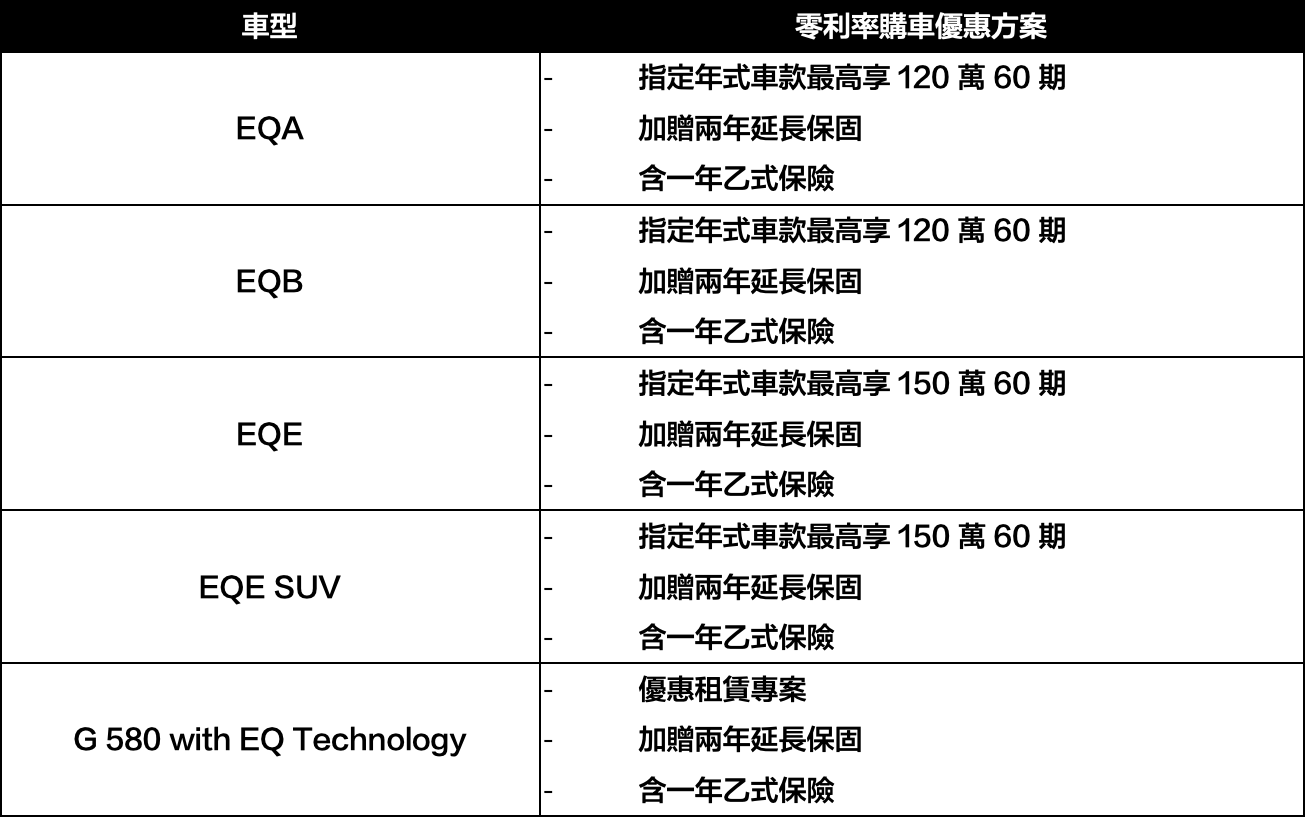 EQE (指定年式車款):最高享 150 萬 60 期零利率,同時加贈兩年延長保固與一年乙式保險。