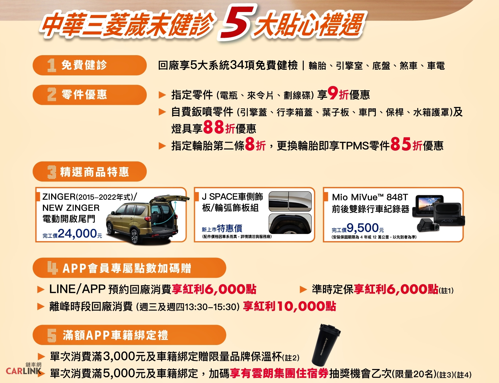為鼓勵數位服務體驗,中華三菱推出Carlife APP車主專屬回饋。凡活動期間單次消費滿3,000元並完成車主APP車籍綁定,即贈限量品牌保溫杯。若單次消費滿5,000元以上,更享有五星級飯店住宿券抽獎機會(歲末期間抽出20名),讓車主在照顧愛車之餘,也有機會贏得新春豪華假期。