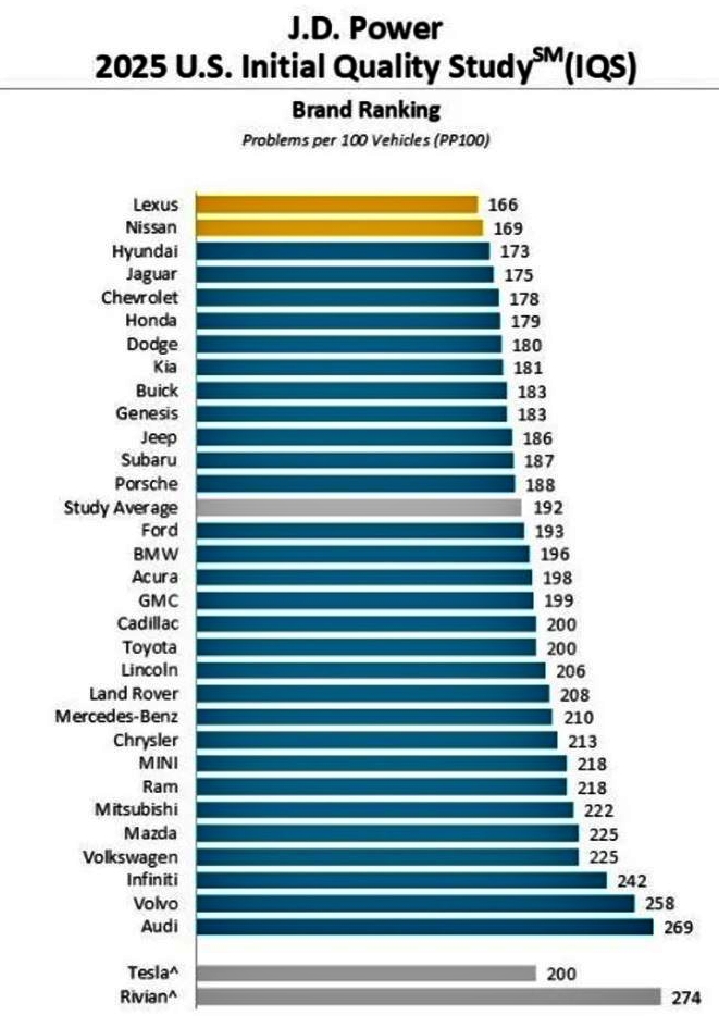 J.D. Power新車品質調查為汽車產業深具指標性的調查研究,亦是全球消費者購車的重要參考依據,2025年NISSAN榮獲大眾市場品牌冠軍,代表其車輛品質與穩定度實質獲得廣大車主肯定。此調查以「每百輛車問題數」(Problems Per 100 vehicles, PP100)作為評分標準,分數越低代表品質表現越佳,NISSAN在大眾市場汽車品牌中取得「每百輛車問題數」最低統計數,在全體汽車品牌排名高居第二,足見NISSAN立基於日式精緻工藝的高水準造車品質表現。