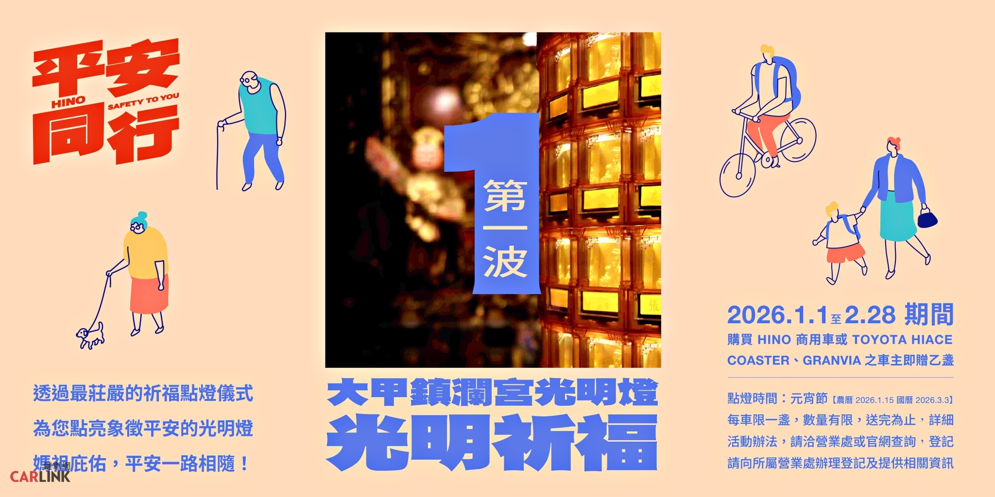 首波行動,和泰商用車以實際回饋感謝車主長期支持。本次「大甲鎮瀾宮光明燈祈福」活動自 2026 年 1 月 1 日起至 2 月 28 日止。凡於活動期間購買HINO 商用車及 TOYOTA COASTER、GRANVIA、HIACE 之車主,即贈送「大甲鎮瀾宮光明燈」乙盞註2。符合資格之車主,須向所屬營業處辦理登記。光明燈將於元宵節(農曆正月十五,2026 年 3 月 3 日) 正式上燈。上燈後,鎮瀾宮誦經團將於農曆每月初一及十五,為燈主恭誦經文、祈福祝禱,象徵全年平安,守護車主每一趟行程安心出發、順利返程。