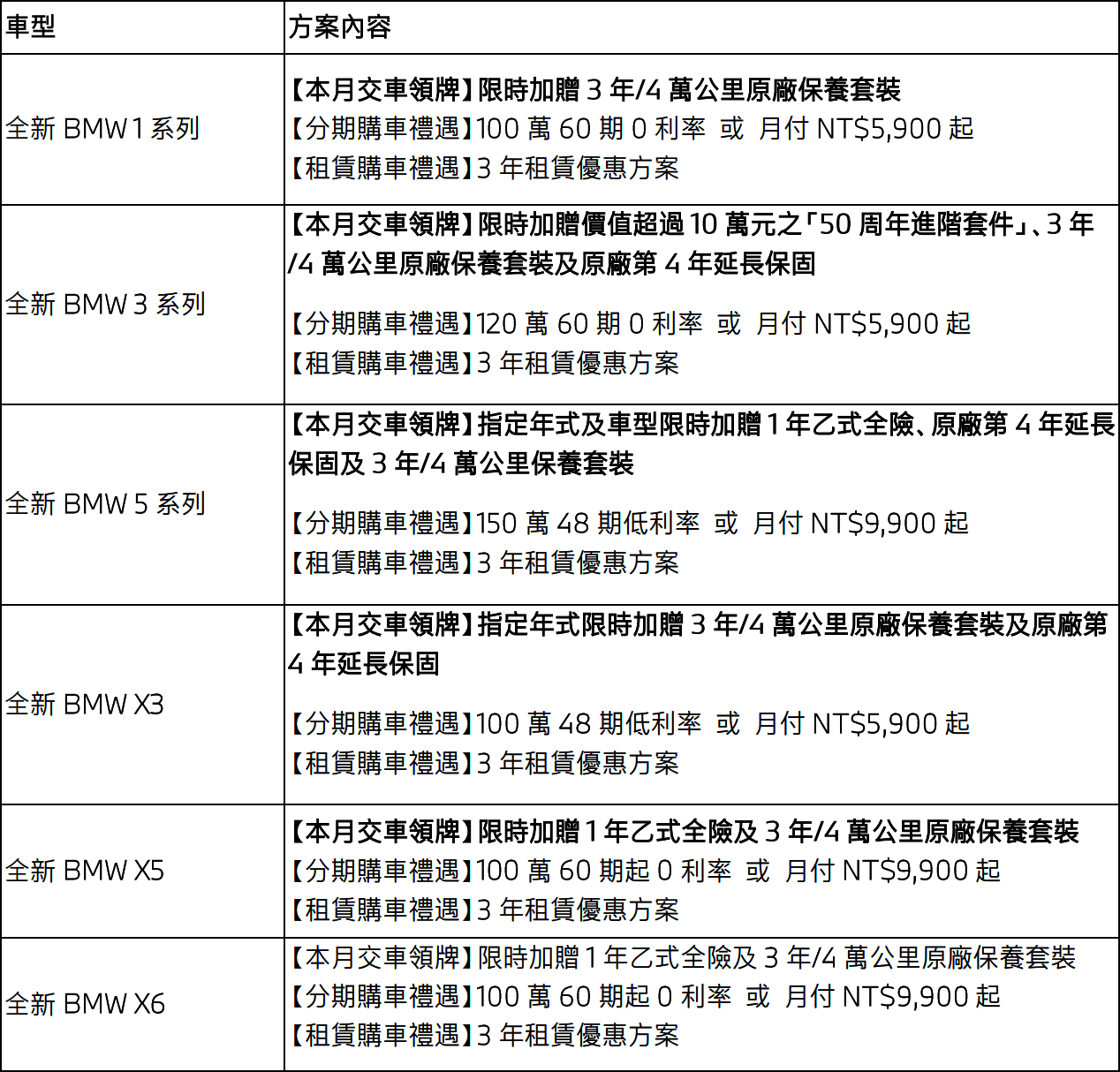 全新BMW X5與X6不僅重新定義大型豪華休旅的高度,也為追求性能、舒適與風格兼備的車主,帶來更具深度與層次的旗艦級駕馭體驗。為回饋消費者支持,BMW總代理汎德推出「BMW新年尊享禮遇」,即日起凡於本月完成交車領牌,即可獲得1年乙式全險及3年/4萬公里原廠保養套裝,讓車主以從容姿態尊榮啟程。此外,更提供多元彈性入主方案,包含指定車型提供100萬元60期起0利率專案,或月付9,900元起的分期購車方案,同時也提供3年租賃禮遇方案,輕鬆實現入主夢想。透過設計美學、頂尖科技與熱血駕馭的全面進化,全新BMW X5與X6不僅重新定義大型豪華休旅的高度,也為追求性能、舒適與風格兼備的車主,帶來更具深度與層次的旗艦級駕馭體驗。為回饋消費者支持,BMW總代理汎德推出「BMW新年尊享禮遇」,即日起凡於本月完成交車領牌,即可獲得1年乙式全險及3年/4萬公里原廠保養套裝,讓車主以從容姿態尊榮啟程。此外,更提供多元彈性入主方案,包含指定車型提供100萬元60期起0利率專案,或月付9,900元起的分期購車方案,同時也提供3年租賃禮遇方案,輕鬆實現入主夢想,全新BMW X5與X6以磅礡動能結合前瞻科技與豪華工藝,重塑豪華休旅的高度與想像,彰顯BMW對純粹駕馭與設計語彙的不懈追求。