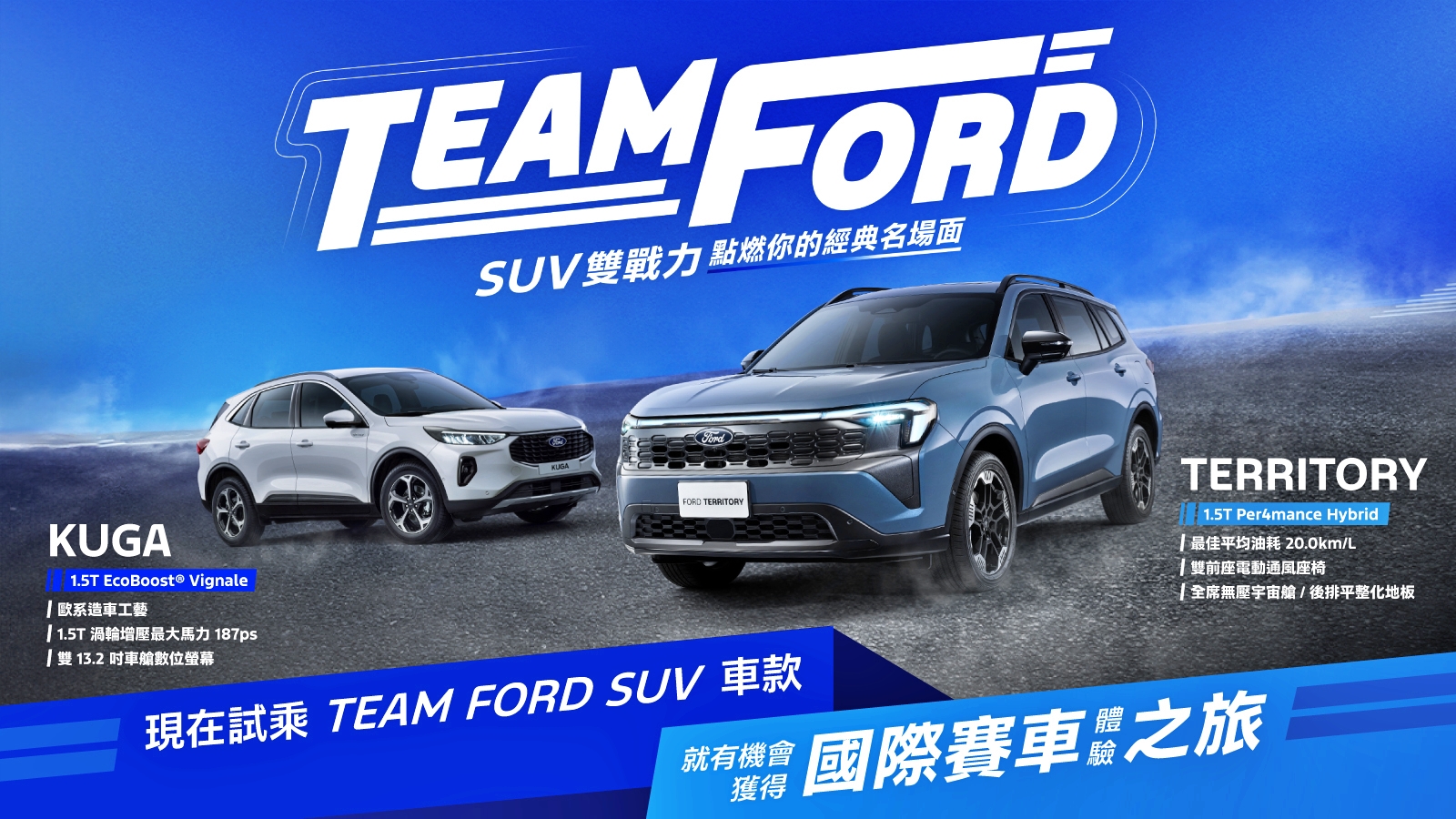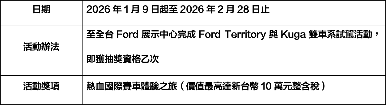 自2026年1月9日起至2月28日止,消費者至全台Ford展示中心完成Ford Territory與Kuga雙車系試駕活動,即可獲得「國際賽車體驗之旅」(行程價值新台幣10萬元整含稅)抽獎資格乙次,最大獎有機會親臨F1 2026新加坡站或日本站,並且親眼見證Ford與Red Bull如何為了勝利而戰。