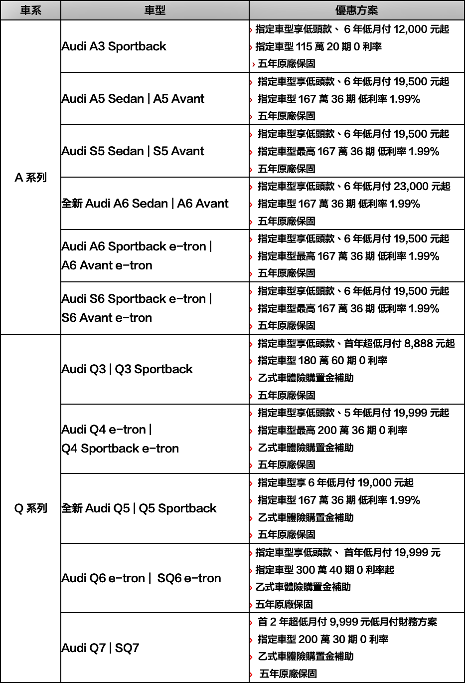 本月財務方案涵蓋低頭款、低月付與零利率 等多元方案選擇,並搭配五年原廠保固,讓消費者可依自身需求與財務規劃,彈性安排入主節奏。其中,Audi Q3 指定車型推出首年超低月付 $8,888 元起優惠,無論作為家庭用車、日常通勤,皆能兼顧實用機能與 Audi 一貫的駕馭質感。