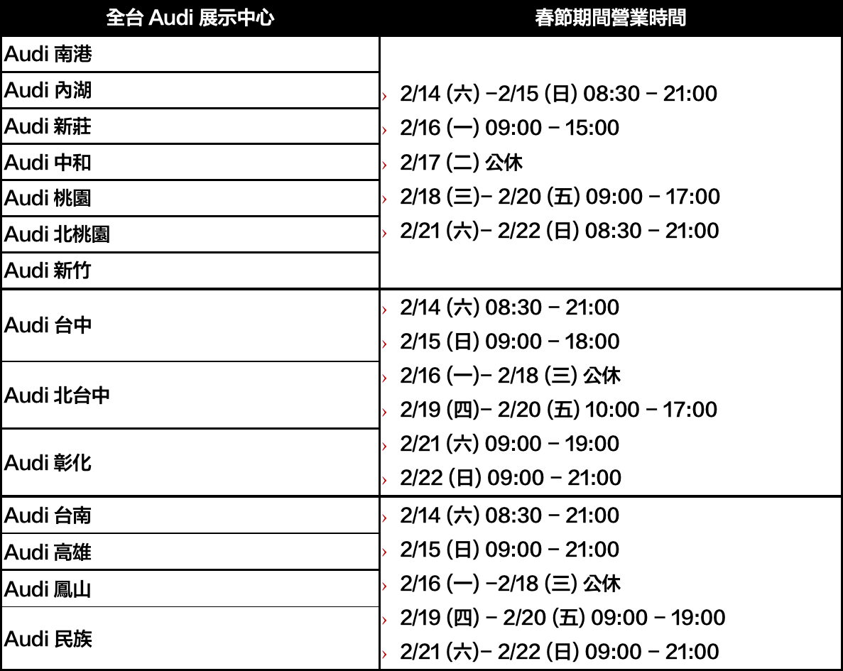 隨着農曆佳節將至,台灣奧迪在此向全台車主與消費者致上最誠摯的新春祝福,春節連假2/14(六)至2/22(日)期間,Audi 24 小時緊急服務專線 0809-092-834 照常運作提供即時支援,期間全台展示中心與服務廠將視據點調整營業時間,敬邀喜愛Audi 的車迷朋友蒞臨展示中心賞車與預約試駕。