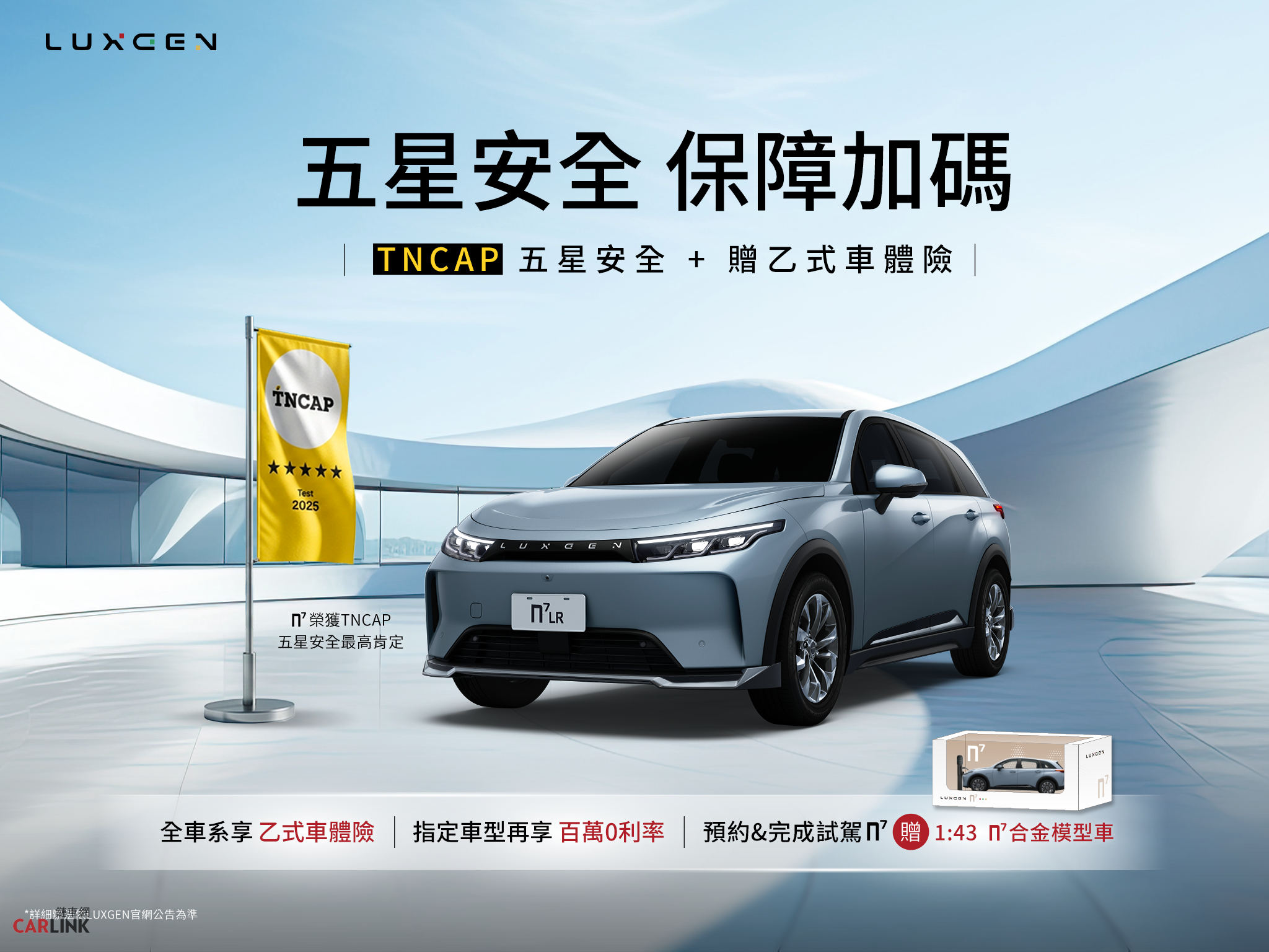 春日出遊之際,不妨帶上親友一同到LUXGEN展間親自體驗純電駕馭樂趣,自2月 27日至 3 月 31 日推出「n⁷ 試乘好禮大方送」活動。凡於LUXGEN官網預約並完成n⁷試駕,即可獲得限量n⁷ 1:43合金模型車乙台,每人限領乙次,數量有限送完為止。透過實際試駕體驗,讓您更深入感受n⁷的純電熱血駕馭與智慧科技魅力。LUXGEN誠摯邀請您把握3月最佳入主時機,親臨全台展示中心賞車試駕,開啟屬於自己的智慧移動新篇章。欲了解更多購車優惠詳情,歡迎至LUXGEN官方網站預約來店賞車,或洽客服專線0800-588-088。
