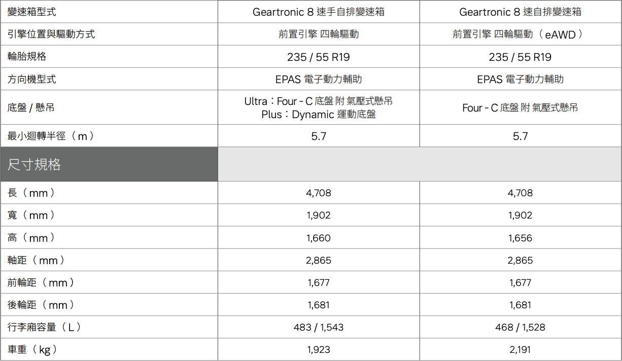 T8 PHEV 車型則採用第二代油電複合動力架構,透過前軸引擎與後軸電動馬達構成 e-AWD 四輪驅動系統,綜效輸出達 455hp / 72.3kgm。搭配 18.8kWh 鋰電池組,可提供最高 86 公里的純電續航與 140km/h 的純電極速,兼具日常通勤的節能表現與高性能駕馭樂趣。