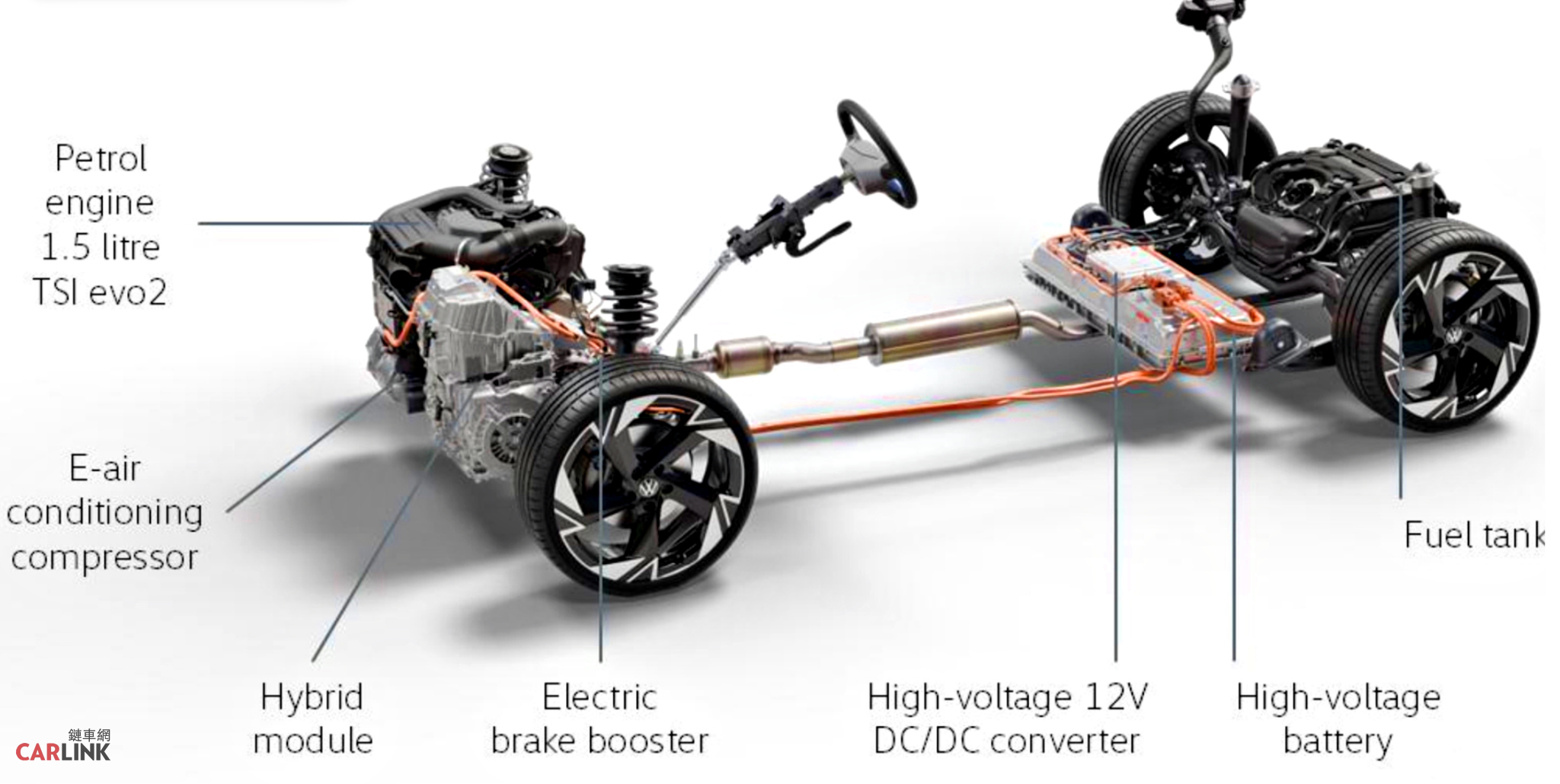 這次VW推出的全新Hybrid架構,並不是簡單的48V輕油電,而是真正Full Hybrid。其核心結構包含了:1.5升 TSI evo2 渦輪汽油引擎、兩具電動馬達、1.6kWh鋰電池、單速變速機構、與電子控制離合器。也就是說,這是一套結合串聯+並聯雙模式的先進油電系統。